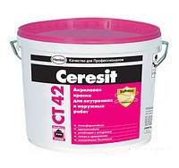 Акрилова фарба Ceresit CT 42 Для фарбування поверхонь усередині та зовні будівель. Властивості атмосферостійка лугувата стійка до стирання низьке водопоглинання Ceresit CT 42 — призначена для нанесення довговічних фарбувальних покриттів на стіни та стелі під час внутрішніх і зовнішніх робіт. Церезит CT 42 випускається 45 різних кольорів, включно з білим. Перелік колірних відтінків і величини відносної яскравості кольорів фарби представлені в таблиці 3 технічного опису на фарбу Ceresit CT 44, оскільки випускаються колірні гами для цих фарб ідентичні. Церезит CT 42 не придатний для фарбування підлог.Основка має бути рівною, сухою і досить міцною. Поверхня його має бути очищена від різного роду забруднень і речовин, що знижують адгезію фарби до основи (пили, жирів, мастильних олій, бітумних мастиок, лакофарбових покриттів тощо). Неміцні, обсипні зони поверхні треба видалити.Вчаски поверхні, покриті мохами, водоростями або поражені грибком, треба очистити сталевими щітками та потім обробити фунгіцидним препаратом Ceresit СТ 99. Великі тріщини та вади на основі рекомендується заповнити матеріалом Ceresit СТ 29 не менш ніж за три доби до початку фарбування. Для ремонту основи можна використовувати інші матеріали торгової марки Ceresit груп СТ, CN і CX, призначені для цієї мети. Докладні вказівки щодо підготовки поверхні до фарбування представлені в таблиці 21 технічного опису на фарбу Ceresit CT 44, оскільки способи підготовки поверхні для цих фарб ідентичні. У місцях, де до зворотного боку фарбувального покриття можливий підхід води, попередньо має бути вироблена гідроізоляція. Фарба Ceresit CT 42 виробляється вже готовою до застосування. Перед використанням вміст ємності треба ретельно перемішати. За потреби можна довести фарбу до потрібної консистенції, додавши до неї невелику кількість води (не більш ніж 15%) і перемішавши повторно. Фарбу наносять на основу за допомогою пензля, валика або фарбопульта. Водночас необхідно стежити за рівномірністю нанесення шару фарби. На світлих основах усередині будівель (наприклад, на шорсткуватих волокнистих шпалерах) зазвичай досить одного шару фарби. На темних, контрастних основах і під час зовнішніх робіт рекомендується наносити два шари фарби. Залежно від умов висихання фарби другий шар можна наносити вже за 4-5 годин. Свіжі залишки фарби змиваються з інструментів водою. Засохлу фарбу можна видалити тільки розчинниками або механічними. Сфера застосування Акрилова фарба Ceresit CT 42 призначена для оброблення поверхонь будівельних конструкцій і елементів всередині та зовні будівель. Зовні будівель — мінеральними основами (бетон, цегла, цементно-піщані штукатурки). Усередині приміщень — як мінеральних, так і органічних основ (воя, полістирольні плити, фанера, деревостружкові та деревоволокнисті плити, гіпсові штукатурки та плити). Фарба застосовується також для оновлення естетичних властивостей декоративних штукатурок, раніше пофарбованих поверхонь, а також у системах теплоізоляції фасадів. готова до застосування екологічно безпечна